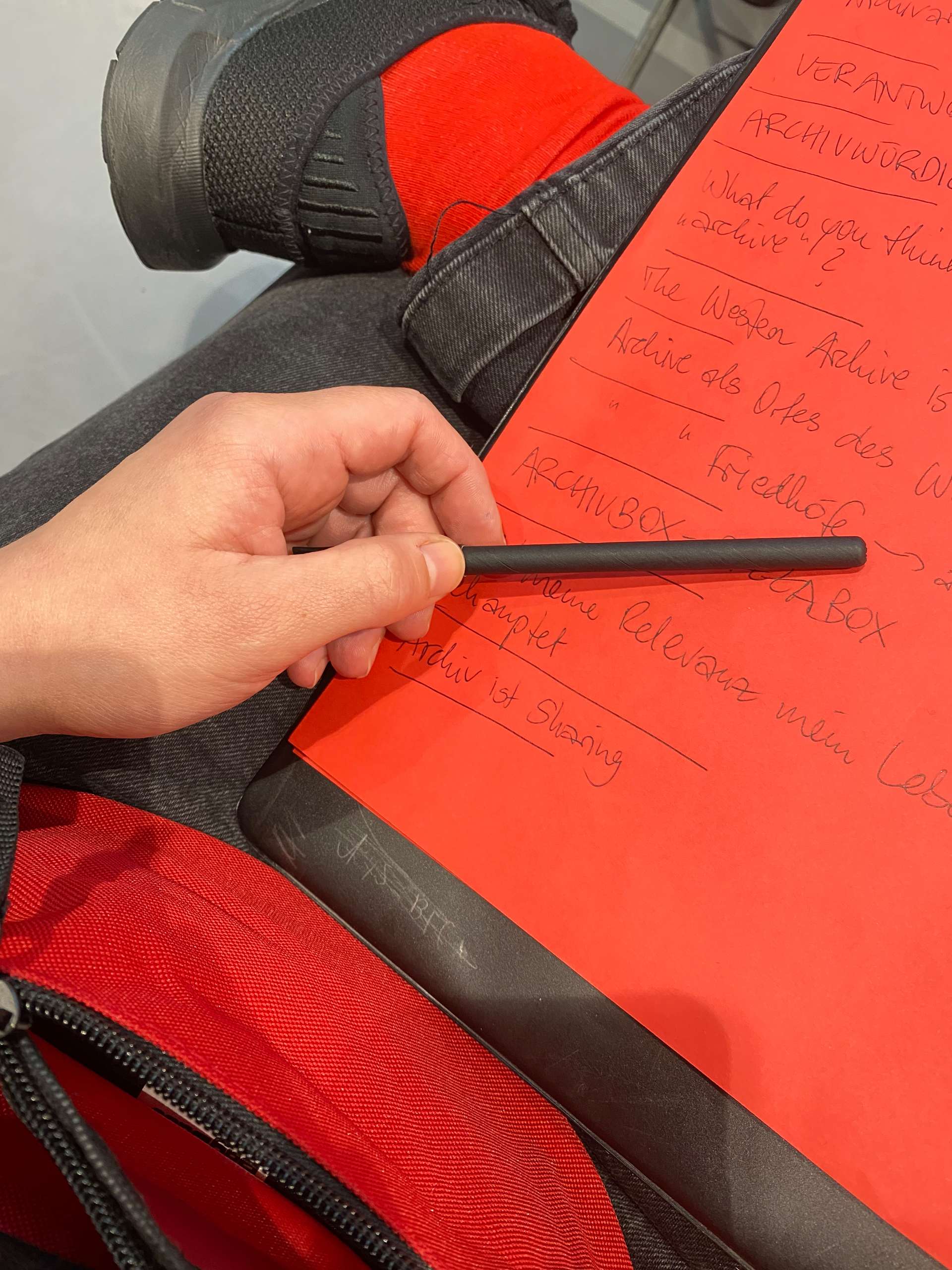 „Das Performance Recording macht aus den vielen Fragmenten, die ein Konferenztag unterwegs abwirft, ein neues Ganzes. Gedankenschnipsel, offene Fragen, Assoziationen und Stimmungen finden in den Gesten, Raumnahmen und Worten der drei Performerinnen eine ganz eigene Form: sinnlich, intuitiv, humorvoll. Diesen Eindruck nehme ich gern mit nach Hause.“ (Wilma Renfordt, DAFDK)